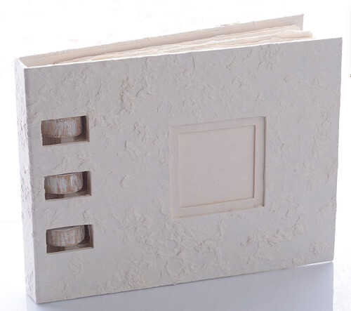 A 3 ring bind bamboo album in natural moonscape handmade paper cover with 20 deckle edge natural handmade paper pages.