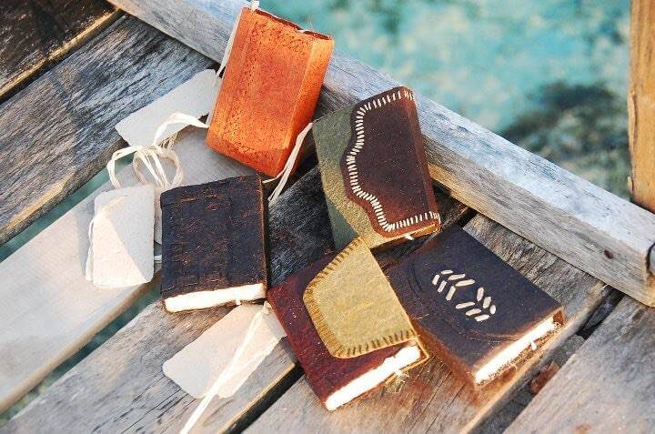 An Earth Travel Journal Collection with flop, garter lock and built in hang bookmark. It has 5 cover designs and 54 deckled barns pages made from abaca cogon base handmade paper.