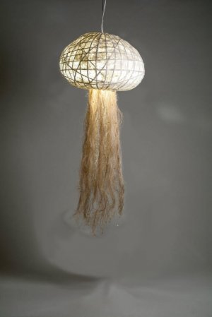 A jellyfish inspired design pendant lamp made from split rattan and shaded with abaca base leatherized natural handmade paper.