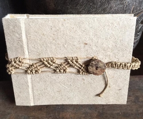 A hard bound natural handmade paper pages in either plain or with special material handmade paper for cover. It is accented with macrame knot designs and coco button for lock.