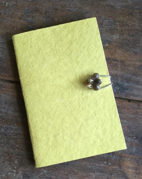 A mini notebook with 20 machine sewn bind straight edge Kraft pages accented with twine, beads and sinamay. It is assembled either with lock, string bookmark or sinamay cover design.