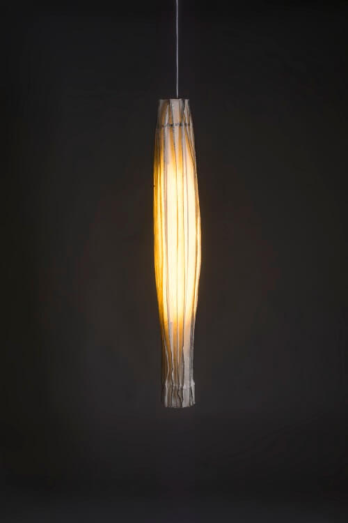 An anemone sea creature inspired lamp. Its frame is made from bamboo skin and buri stick shaded with leatherized pleated natural handmade paper accented with blanket stitch.