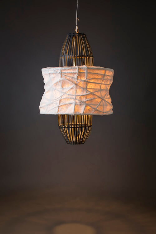 A fish catcher inspired pendant lamp. Its shade is made from split rattan and abaca cogon base leatherized natural handmade paper. While its frame is made of thick bamboo skin black color.
