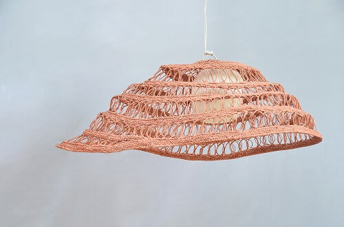 A pendant lamp made from paper twine in macrame knot design shaped into sea shell. Collapsed as packed.