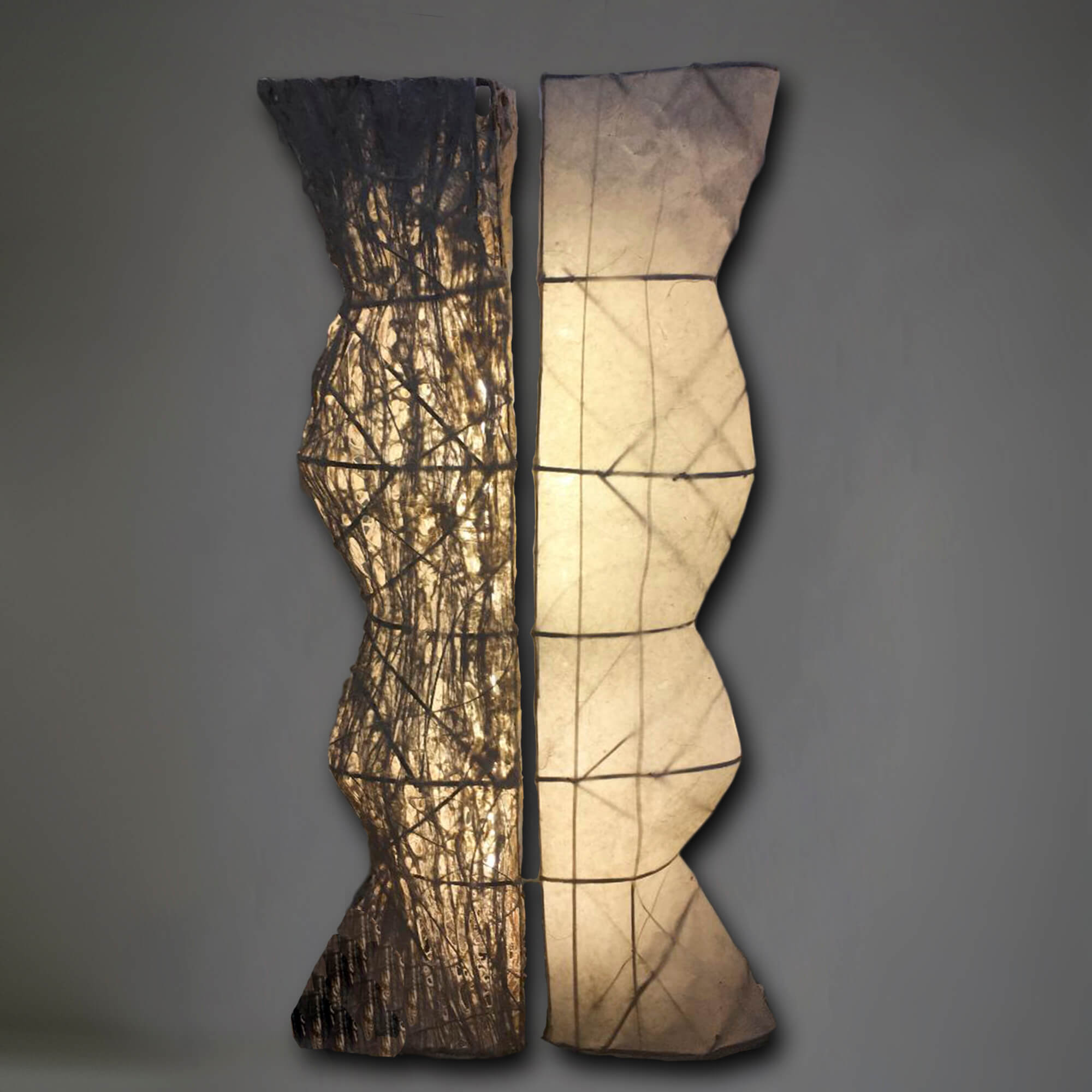 A yin yang inspired pair of floor lamp. Its frame is made of bamboo skin, half is shaded with abaca cogon base natural handmade paper and other half is covered with abaca fiber with patches of pulp.